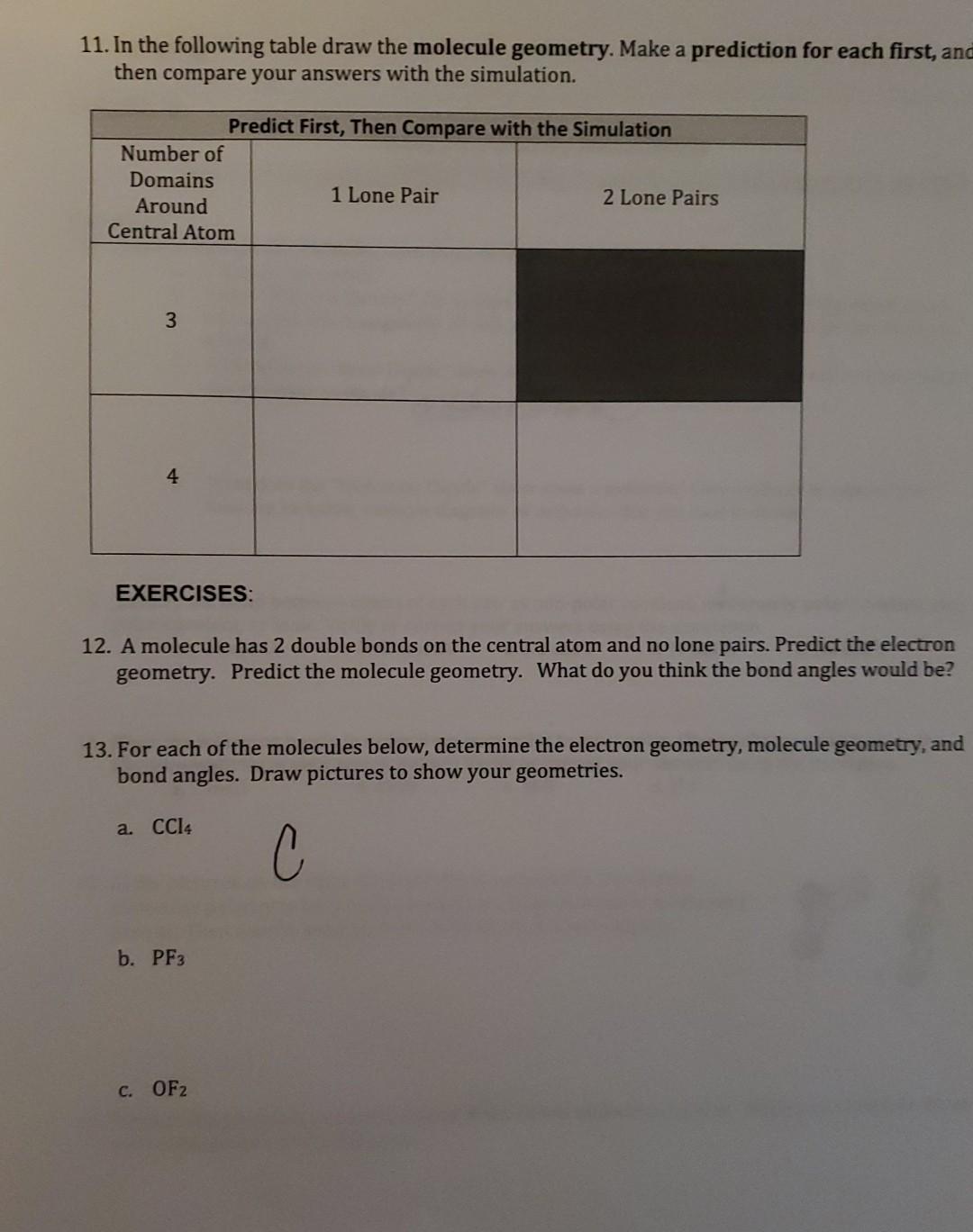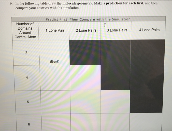 Predict First Then Compare with the Simulation Number of Domains Around Central Atom 1 Lone Pair 2 Lone Pairs 3 Lone Pairs 4 Lone Pairs. 10 Fill in the table below to determine the molecular geometry for the following molecules. 2 bonds 1 lone pair.
